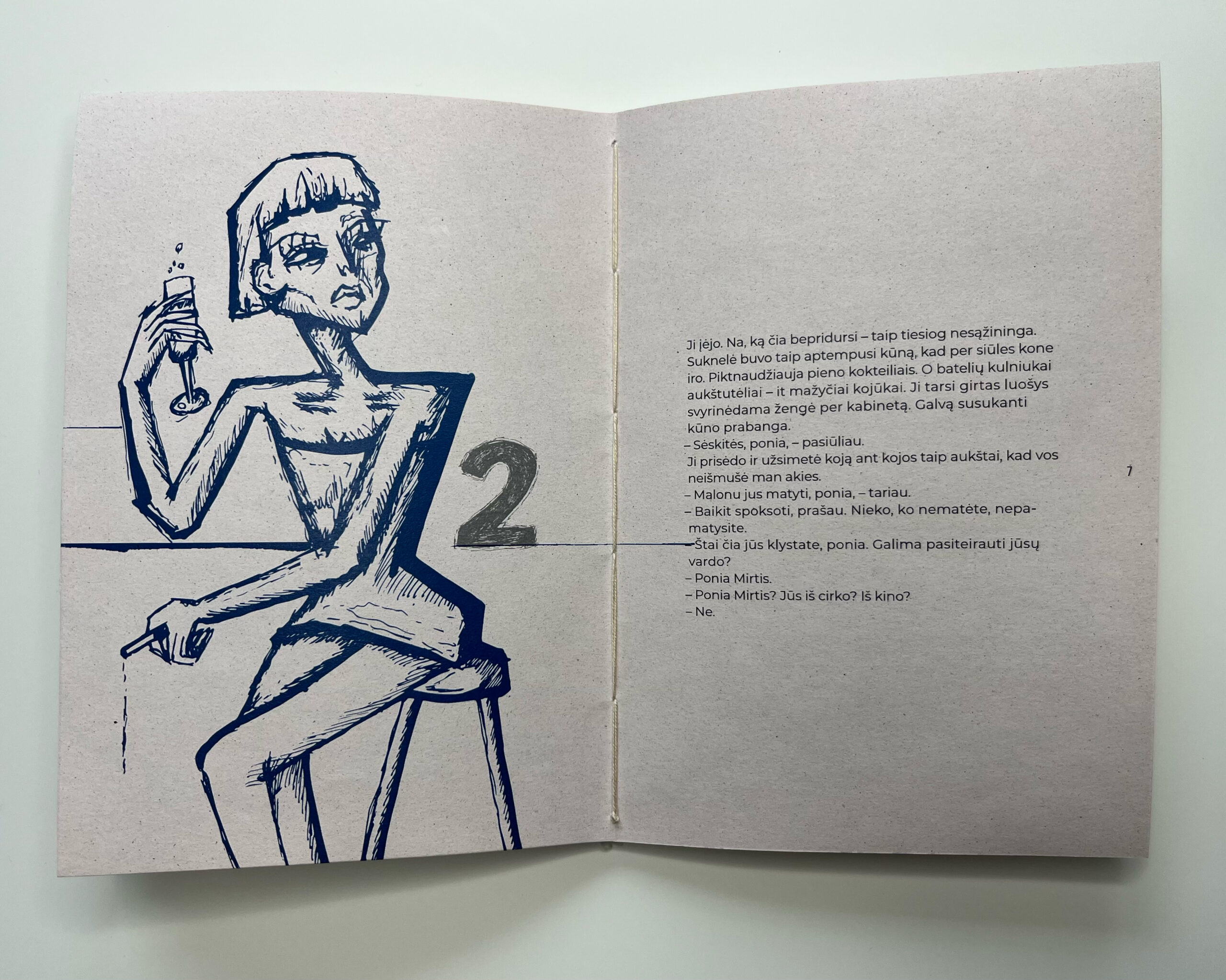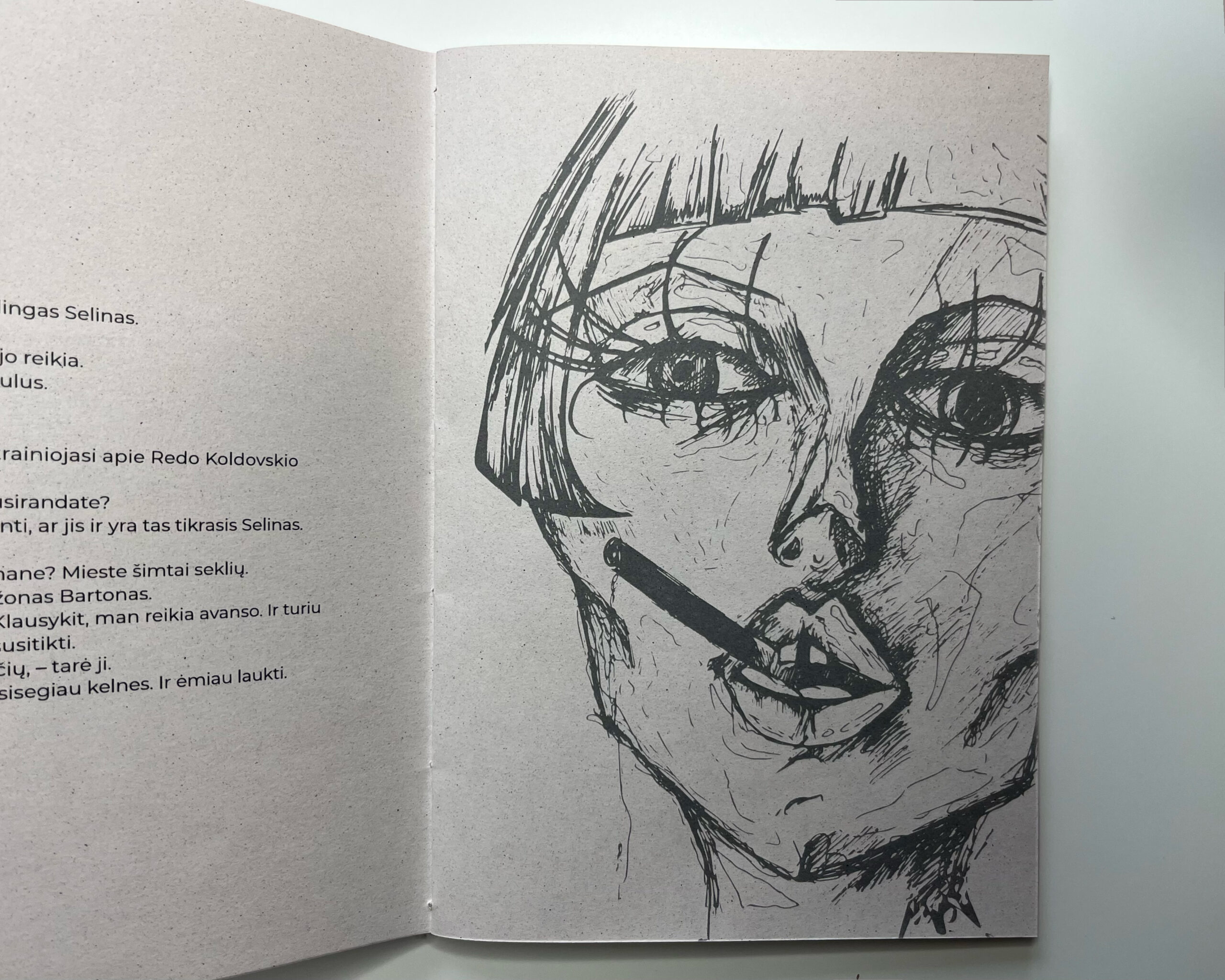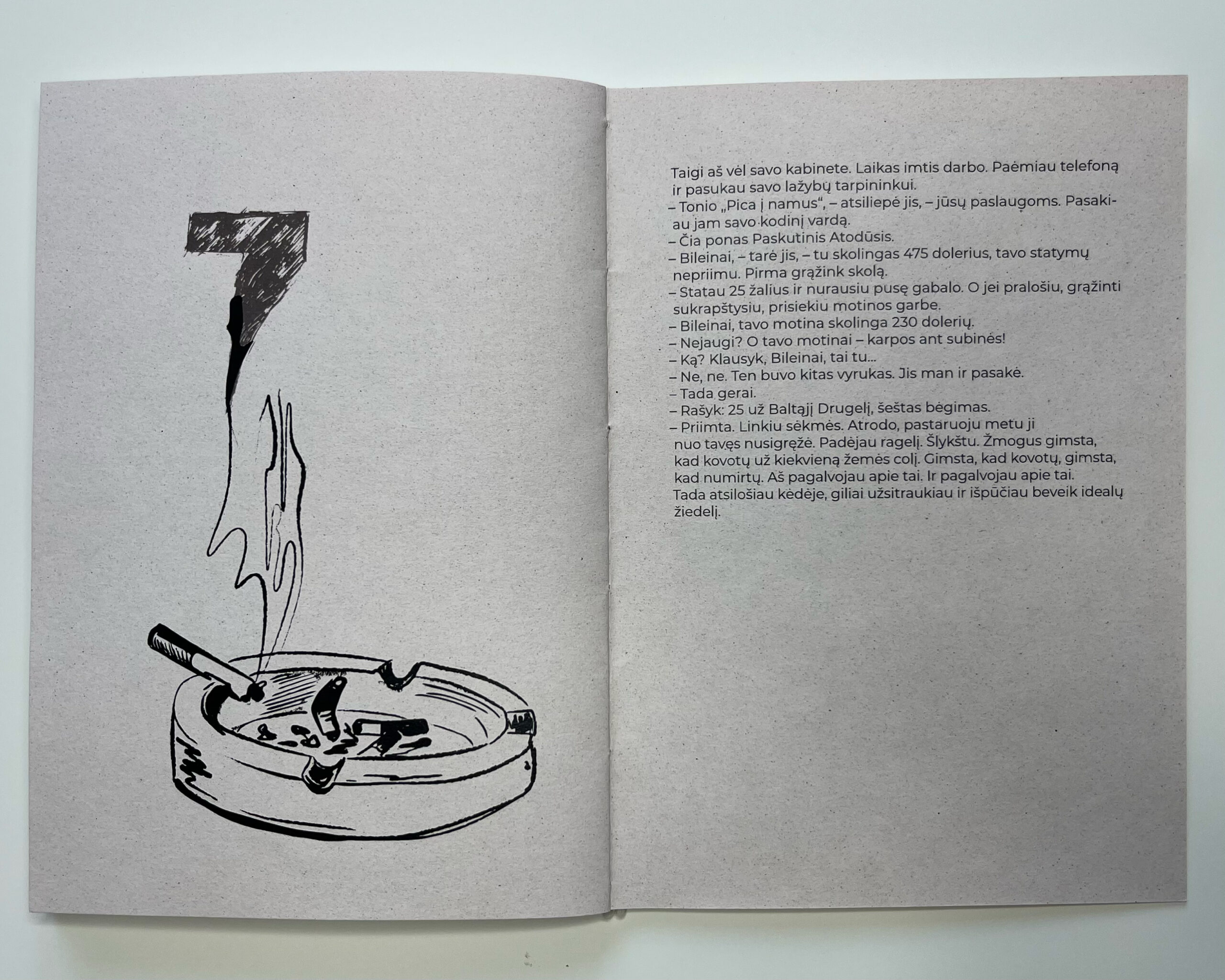 An illustrated and designed excerpt from Charles Bukowski’s Pulp (Skaitalas in Lithuanian). The hand-drawn, harsh black-and-white line illustrations convey the vulgarity, rawness, and cynical attitude characteristic of the author’s work.