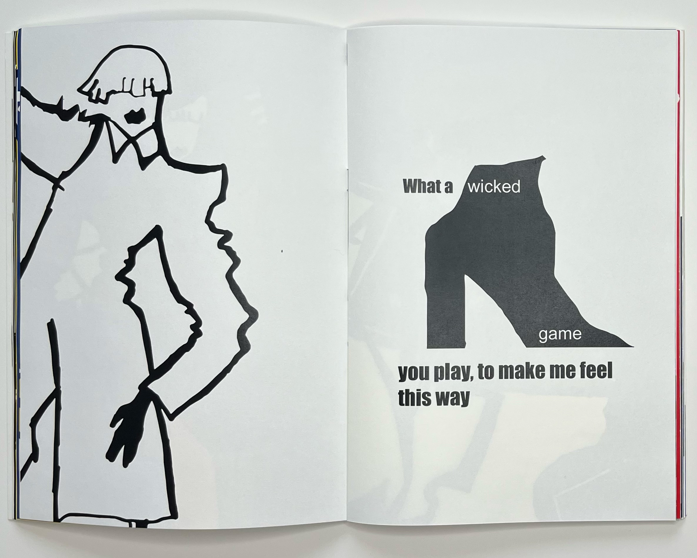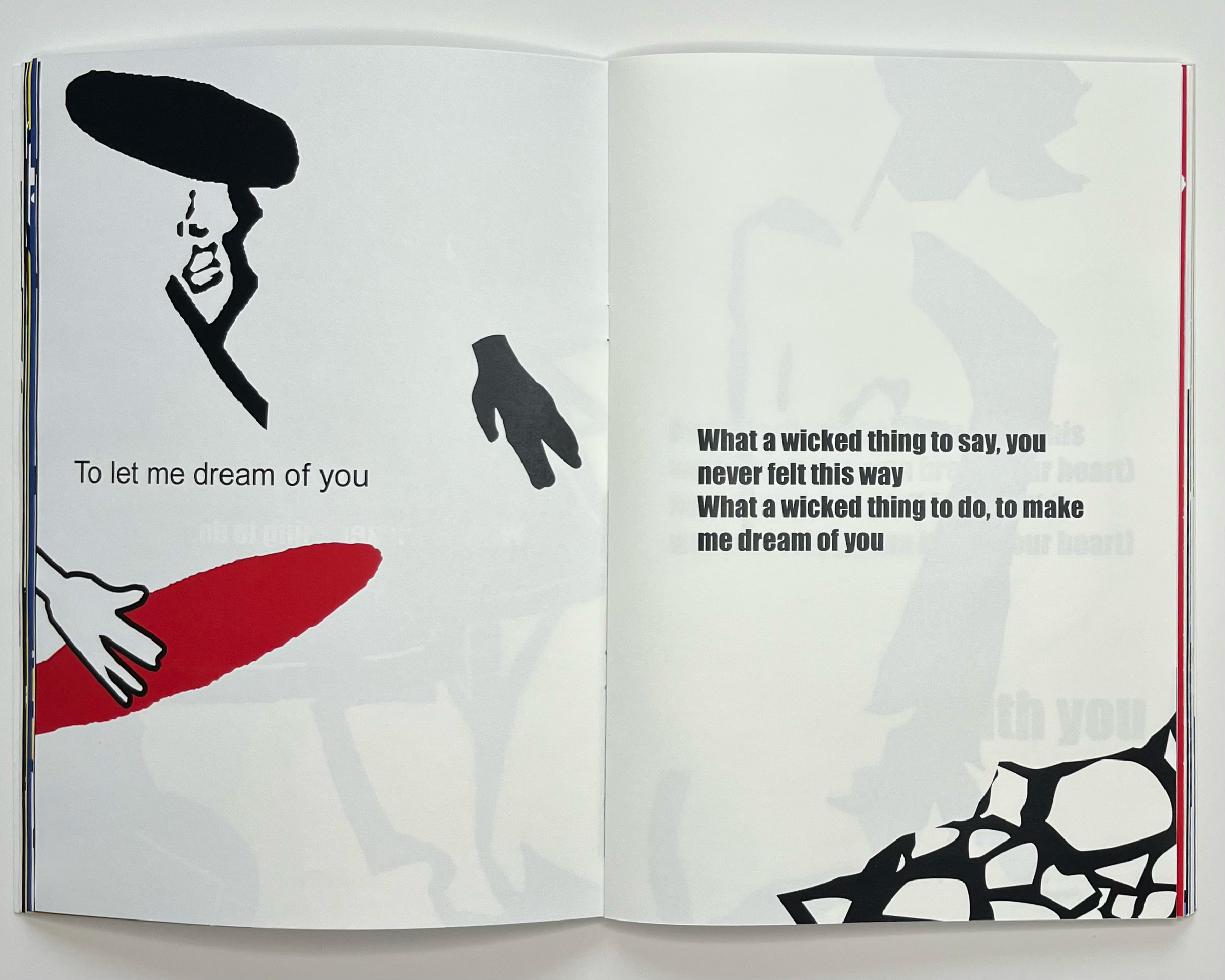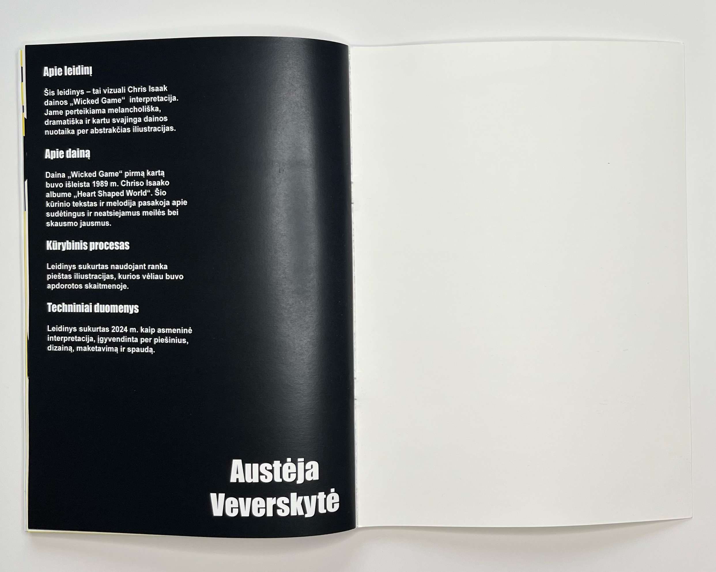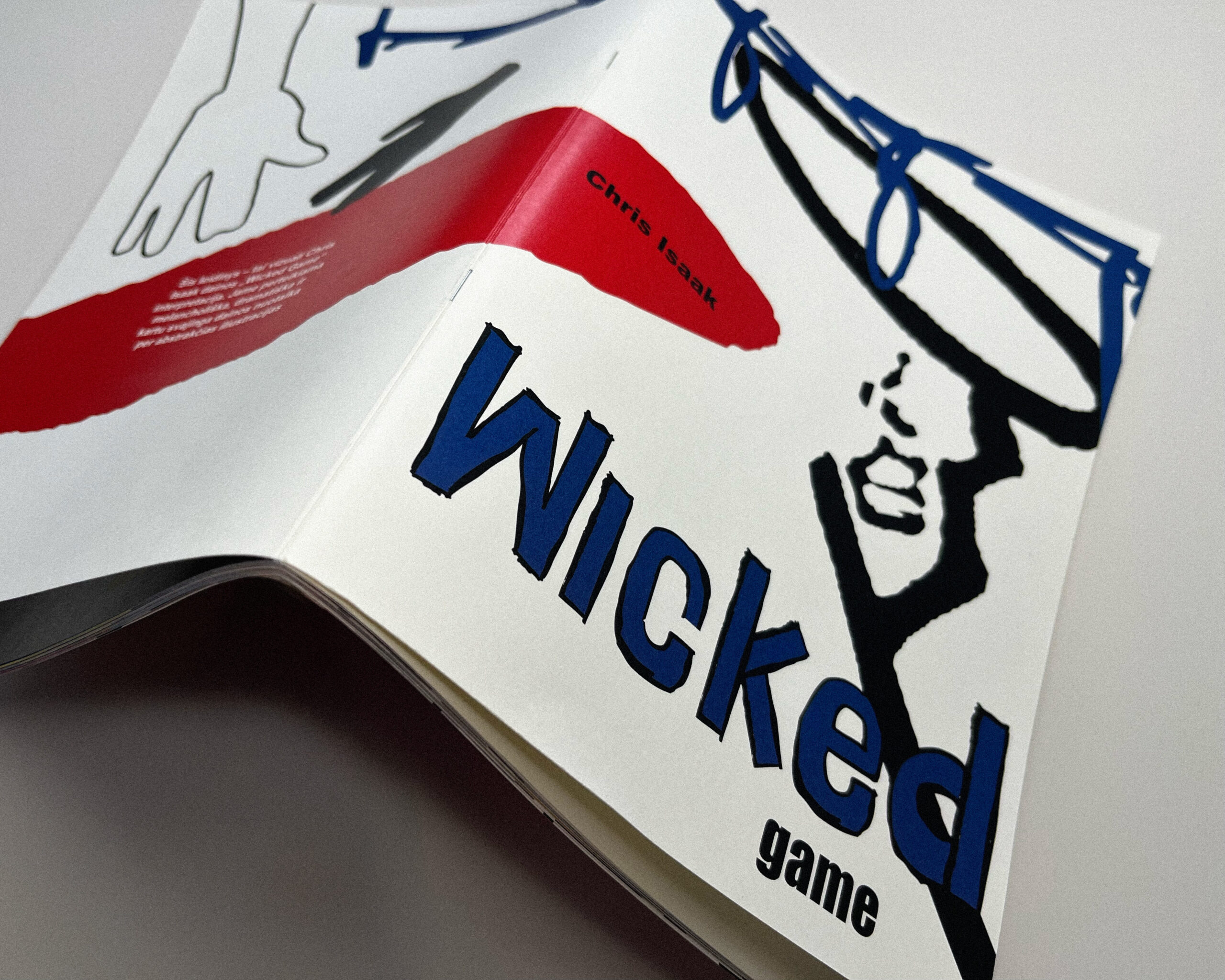 A publication interpreting themes of melancholy, passion, and pain, inspired by the song Wicked Game by Chris Isaak. The visuals create a dreamlike space where love becomes a game without clear rules. The publication features hand-drawn illustrations, strong contrasts in color, and shifting text sizes and rhythm that follow the emotional intensity of the song.