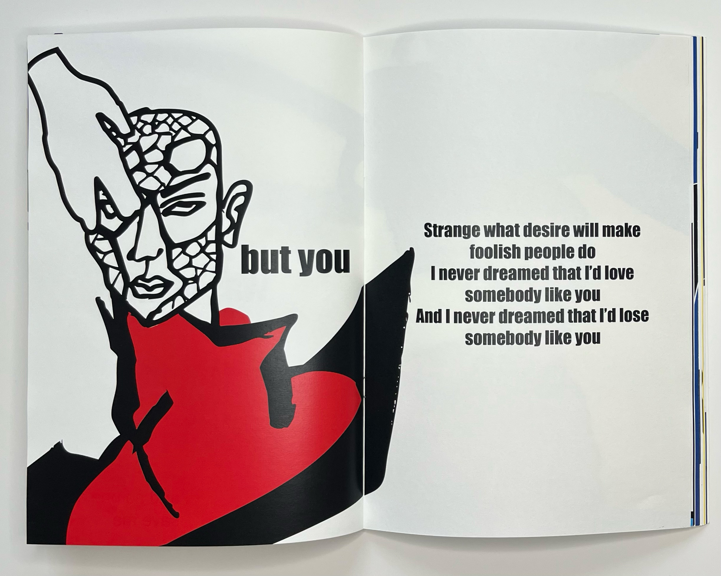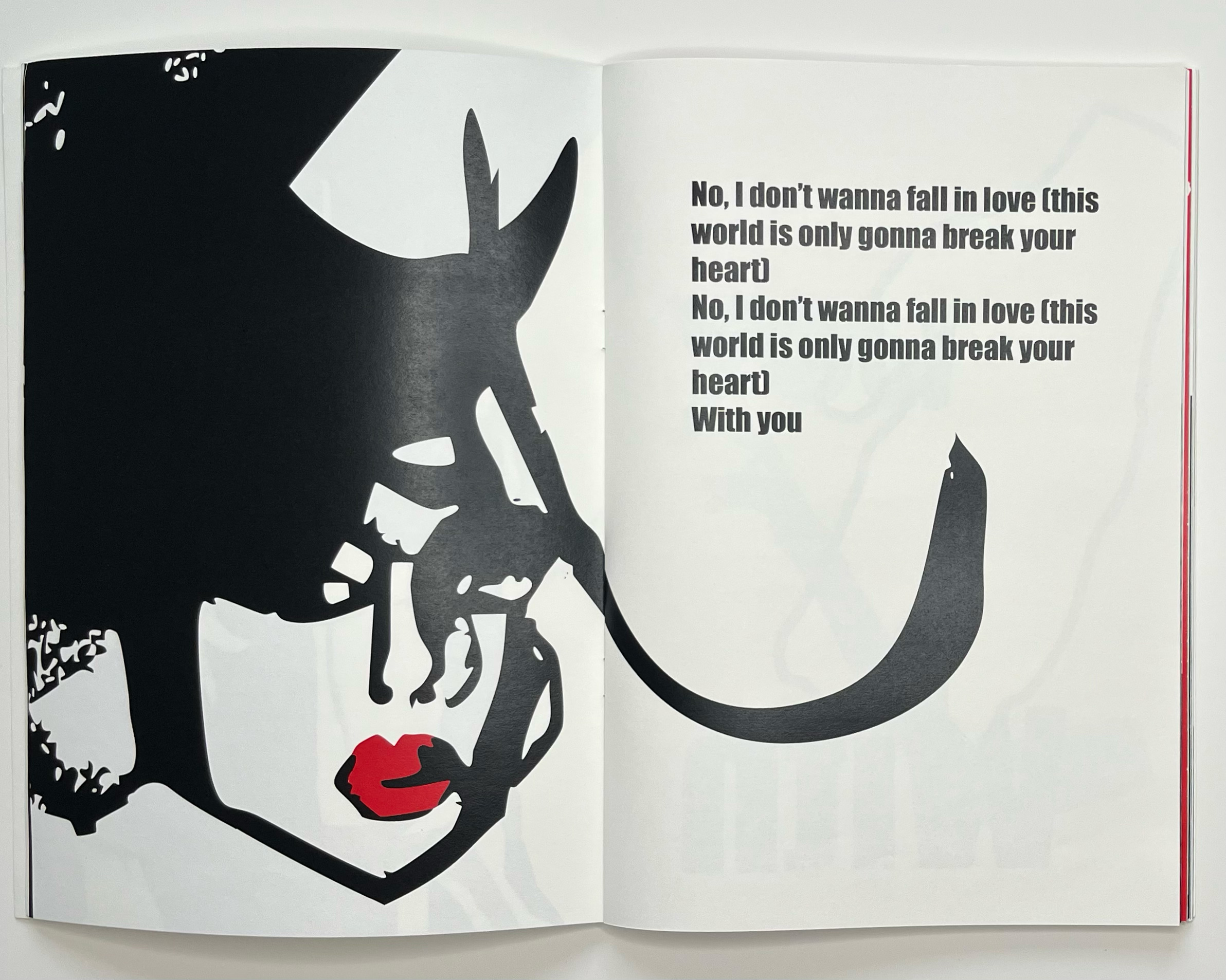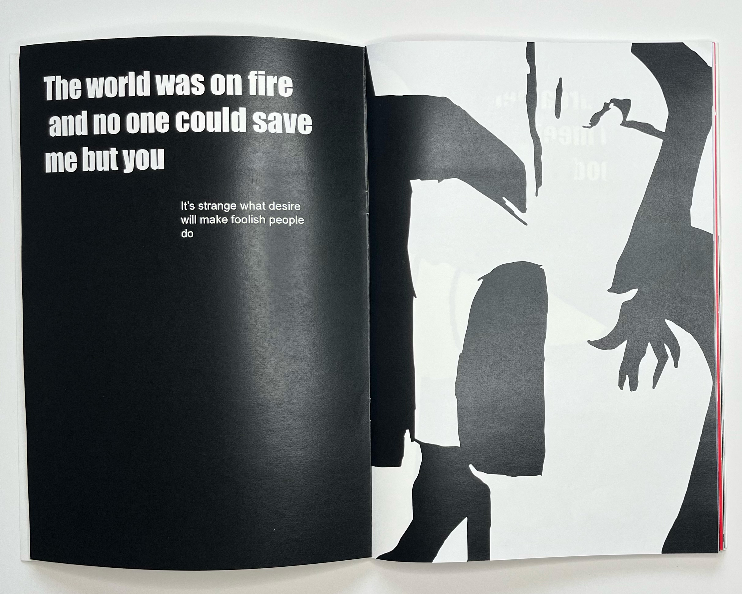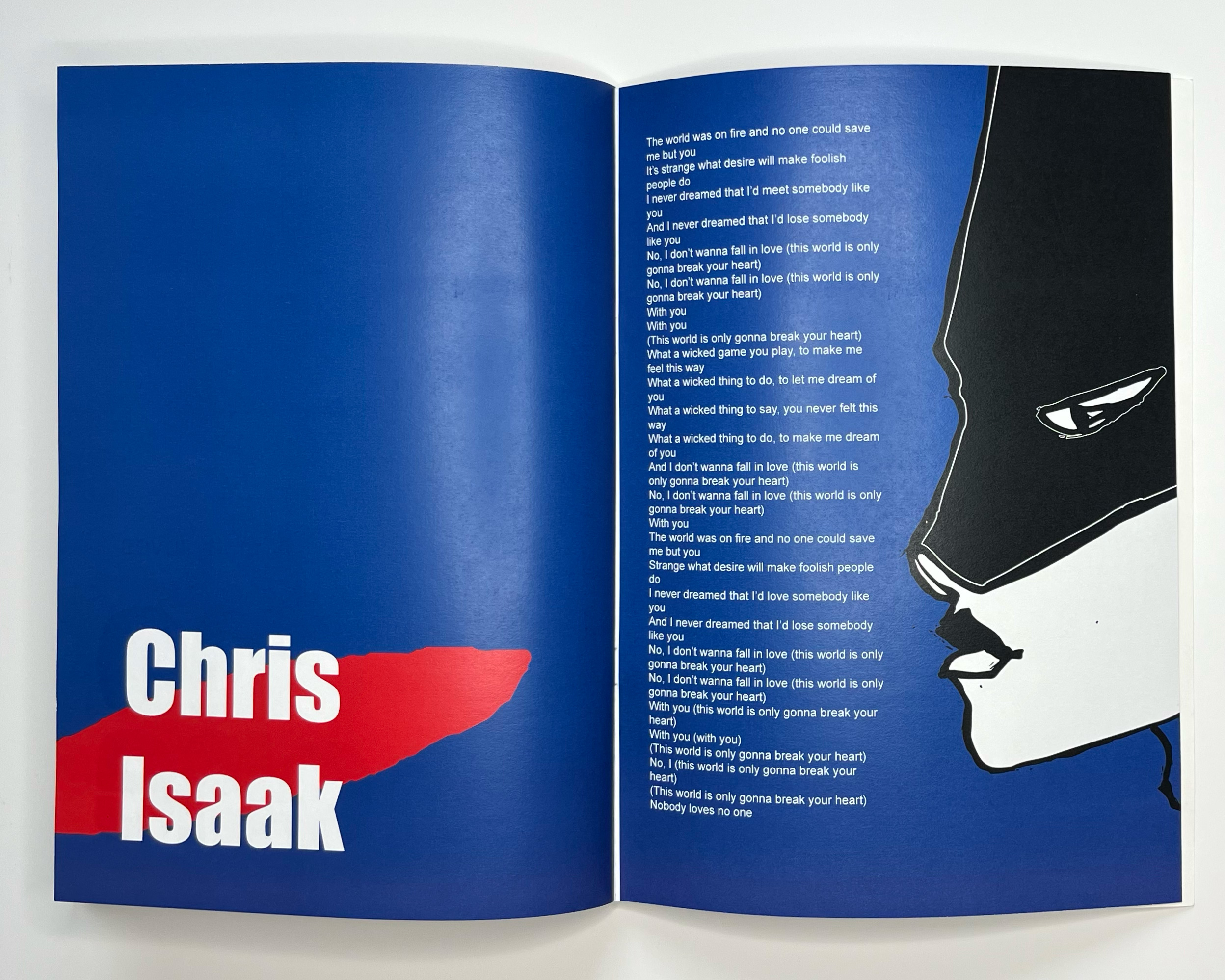 A publication interpreting themes of melancholy, passion, and pain, inspired by the song Wicked Game by Chris Isaak. The visuals create a dreamlike space where love becomes a game without clear rules. The publication features hand-drawn illustrations, strong contrasts in color, and shifting text sizes and rhythm that follow the emotional intensity of the song.